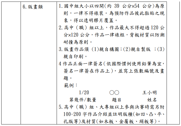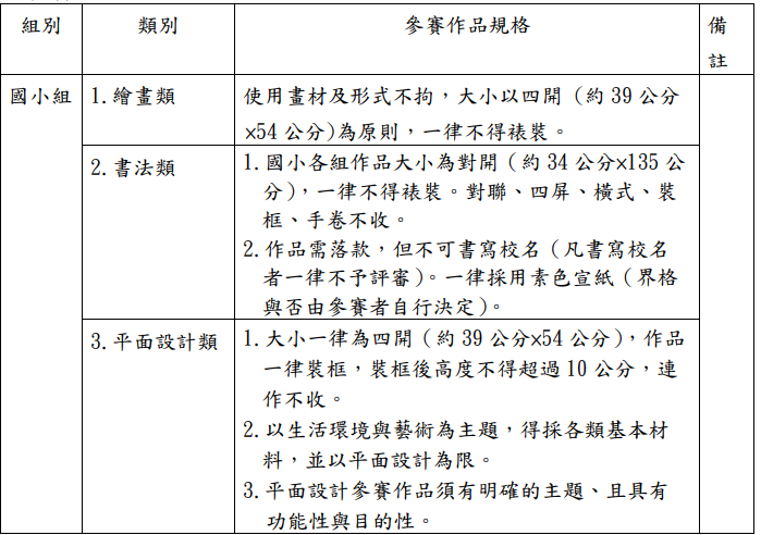 1. 國小組分繪畫類、書法類、平面設計類、漫畫類、水墨畫類、版畫類等六類。