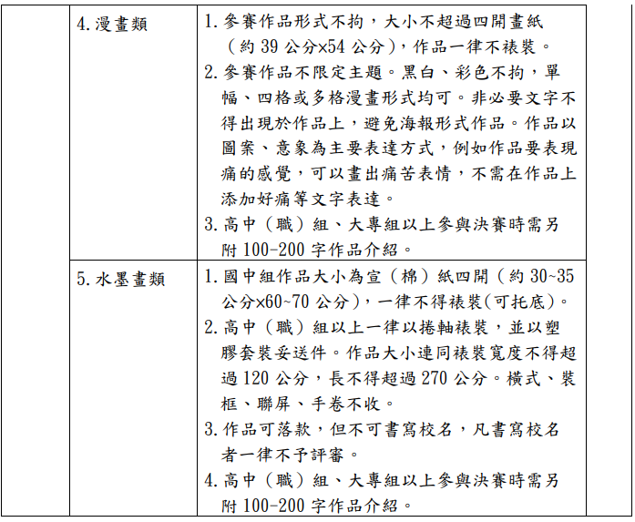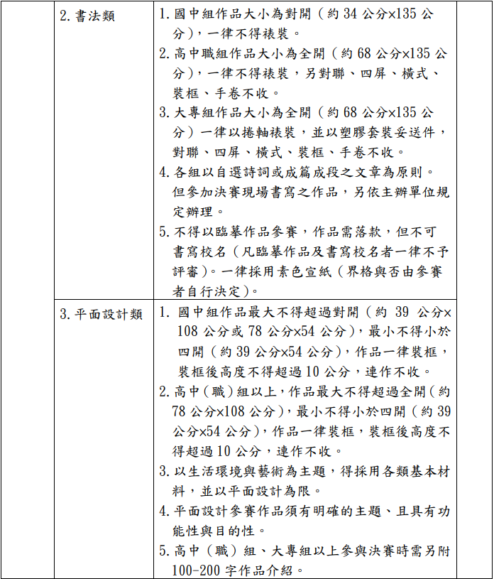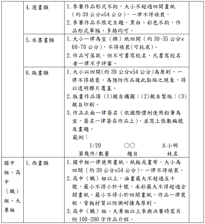 2. 國中組、高中(職)組及大專組分西畫類、書法類、平面設計類、漫畫類、水墨畫類、版畫類等六類。