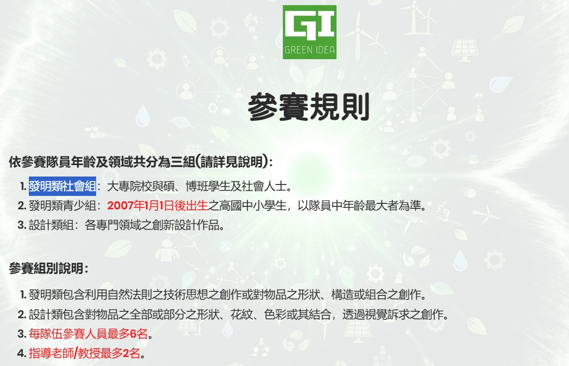 一、本競賽依照參賽隊員年齡及領域共分為三組:發明類社會組、發明類青少組、設計類組,報名截止日期為115年6月30日,競賽相關訊息請詳見官網:https://www.greenidea.asia/